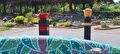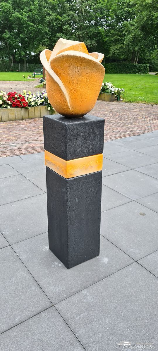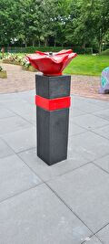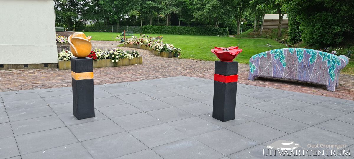 De urn objecten, in de vorm van een bloem op een zuil, staan op een in het oog springende locatie.